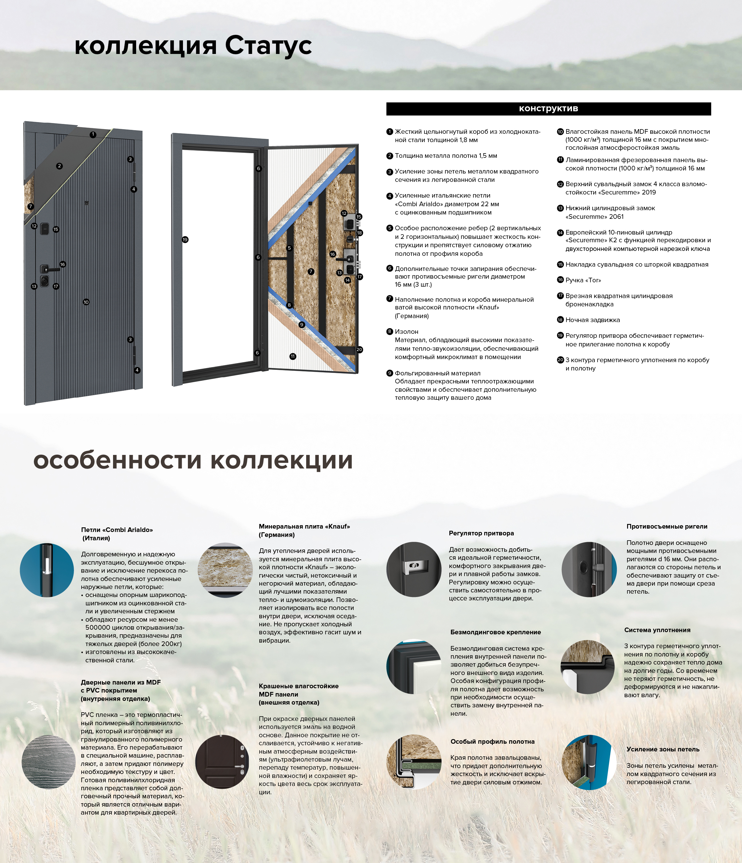 • Усиленные петли на подшипниках • Усиление зоны петель легированным металлом квадратного сечения • Усиление замковой части металлическим карманом • Регулятор притвора (обеспечивает плотное прилегание дверного полотна к коробу) |